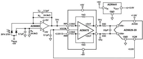 高速光電二極管信號(hào)調(diào)理電子線路圖介紹本文聚焦于一款高速光電二極管信號(hào)調(diào)理電路,其具備暗電流補(bǔ)償功能,旨在高效轉(zhuǎn)換高速硅 PIN 光電