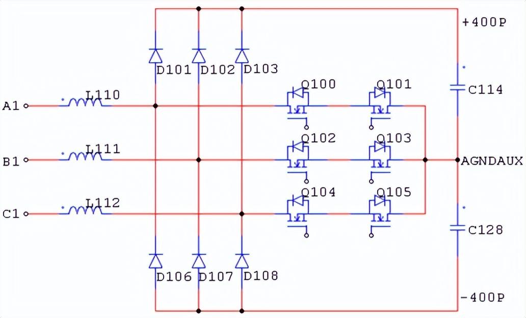 三相三電平PFC電路的工作原理介紹圖 1 三相無(wú)中線三電平PFC拓?fù)鋱D電路圖說(shuō)明:1 A1、B1、C1是三相交流輸入,L110、L111、L112是Boost電